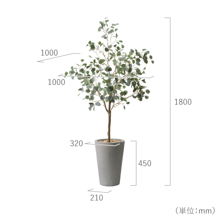 素材:プランター/マグネシアセメント・ガラスファイバー、人工樹木/葉(ポリエステル・再生ペット100%)、枝(ポリエチレン・再生PE40%+バージンPE60%)、幹(ウレタンもしくはポリエチレン・再生PE40%+バージンPE60%)