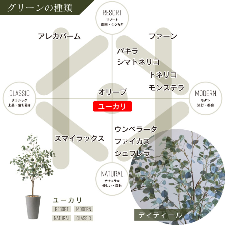 古放射線状に広がる枝に、丸く小さい葉がたくさんついたユーカリは、インテリアとしての見応えが抜群。