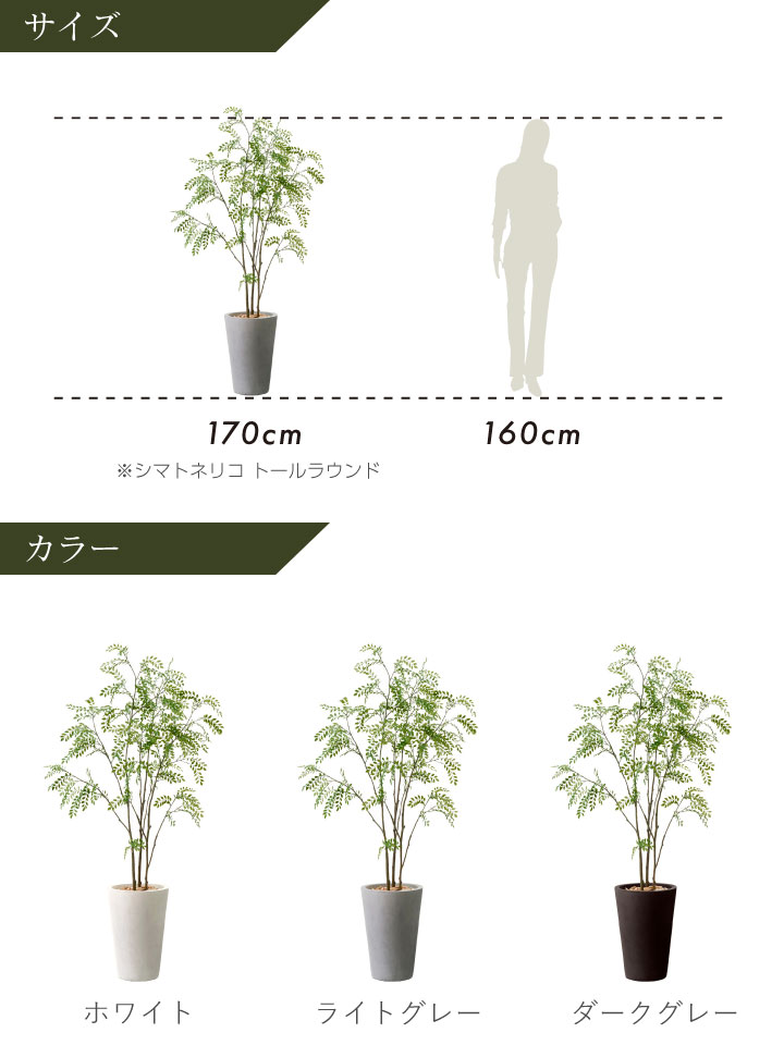 素材:プランター/マグネシアセメント・ガラスファイバー、人工樹木/葉(ポリエステル・再生ペット100%)、枝(ポリエチレン・再生PE40%+バージンPE60%)、幹(ウレタンもしくはポリエチレン・再生PE40%+バージンPE60%)