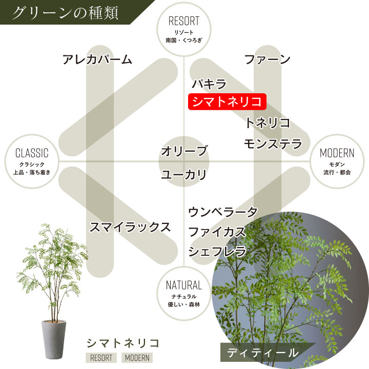 水やりなどメンテナンスフリーで、手軽に屋内へグリーンを取り入れられ、自然な風合いながらも生木よりも軽いので移動もしやすく、害虫や花粉などの心配がいらず屋内で場所を選ぶことなく置くことができます。