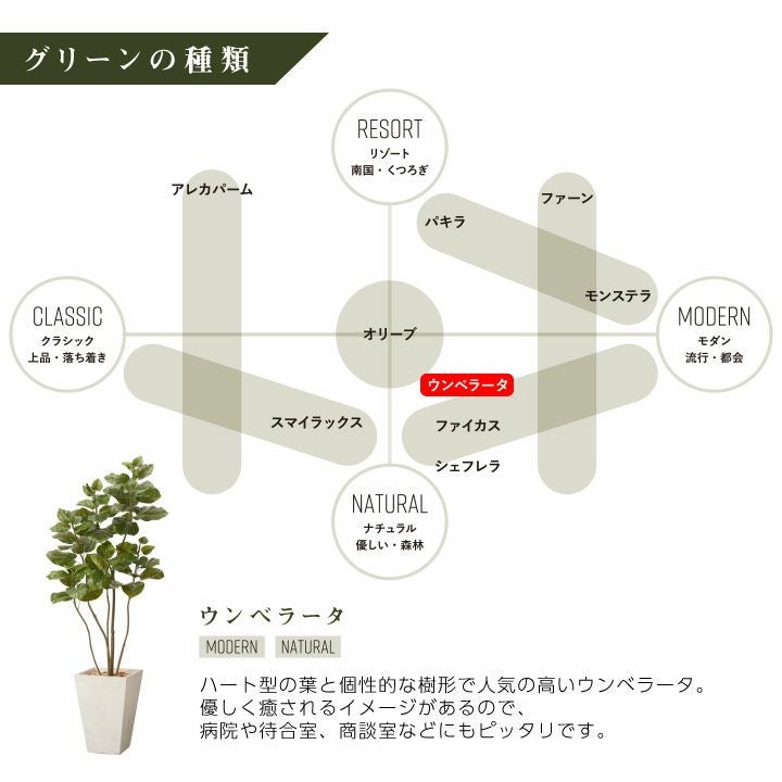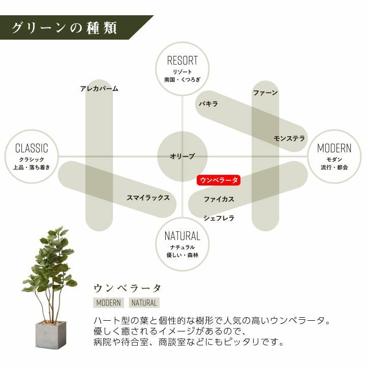 他の画像を見る wg CLAY クレイ フェイク 7-008 910-101 キューブ 165cm以下 フェイクグリーン リアル 大型「ウンベラータ×Cube w/g」[高さ150cm・人工樹木・人工観葉植物 鉢セット] 販売価格 ¥ 50,600 税込 詳細を見る お気に入りに登録する (0)