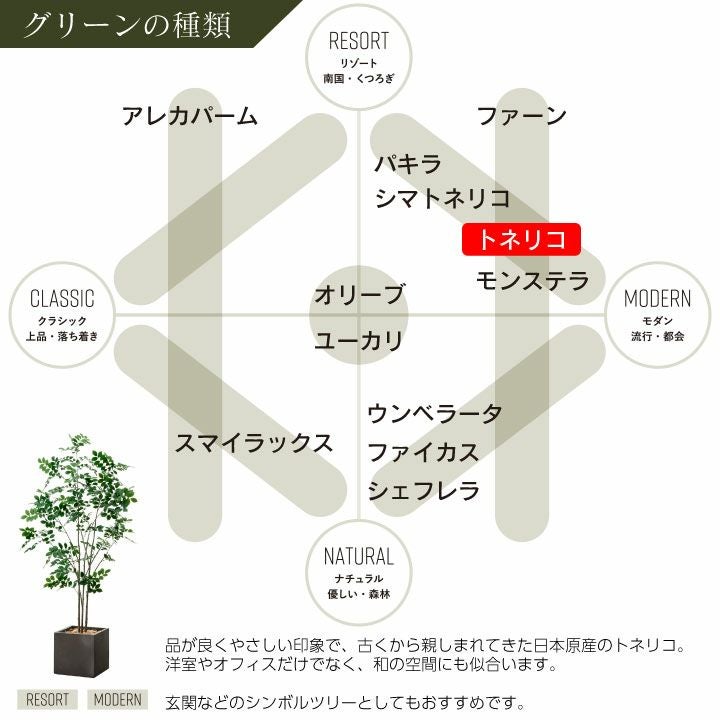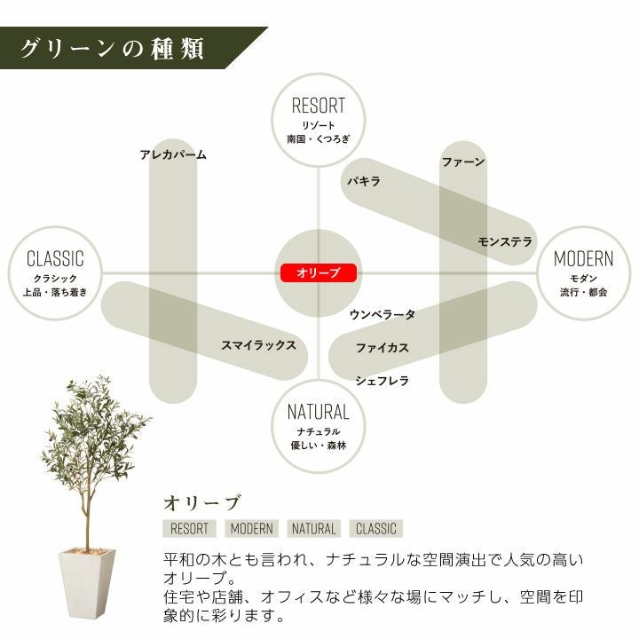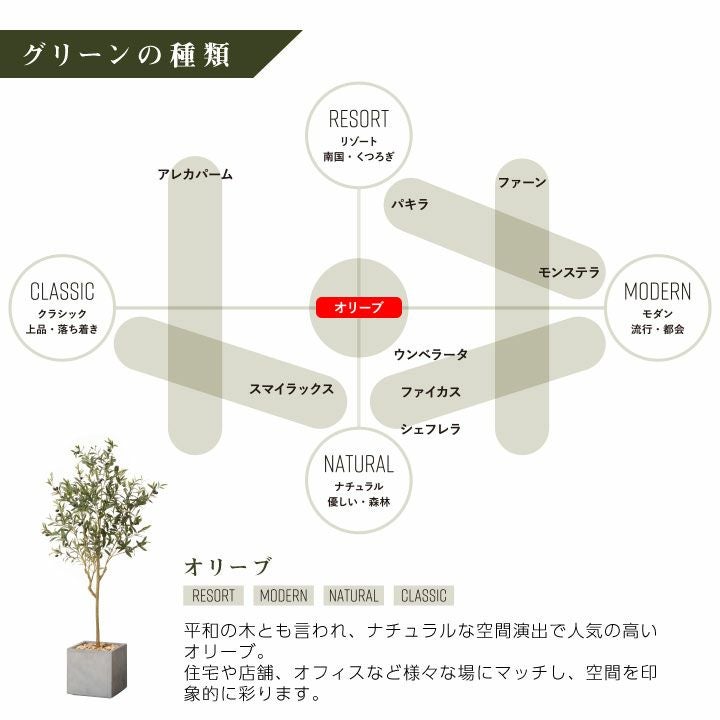他の画像を見る wg CLAY クレイ フェイク 7-001 910-101 キューブ 165cm以下 フェイクグリーン×プランターセット「オリーブS×Cube w/g」[高さ165cm・人工樹木・人工観葉植物] 販売価格 ¥ 60,500 税込 詳細を見る お気に入りに登録する (0)