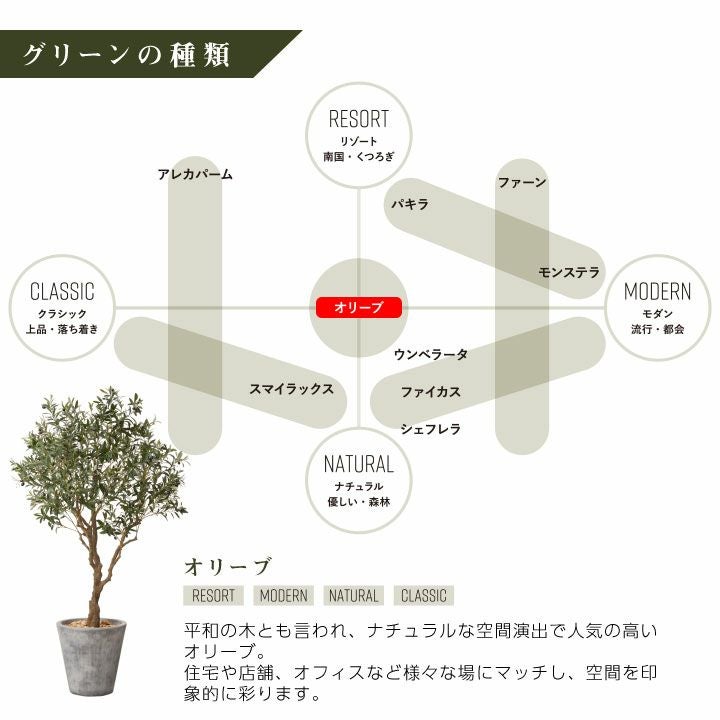 他の画像を見る wg CLAY クレイ フェイク 7-005 910-223 ラウンド 170cm以上 フェイクグリーン 大型 リアル プランターセット「オリーブL×Round w/g」[高さ210cm・人工樹木・人工観葉植物] 販売価格 ¥ 129,800 税込 詳細を見る お気に入りに登録する (0)