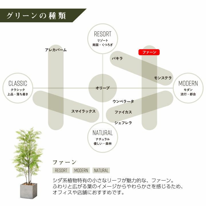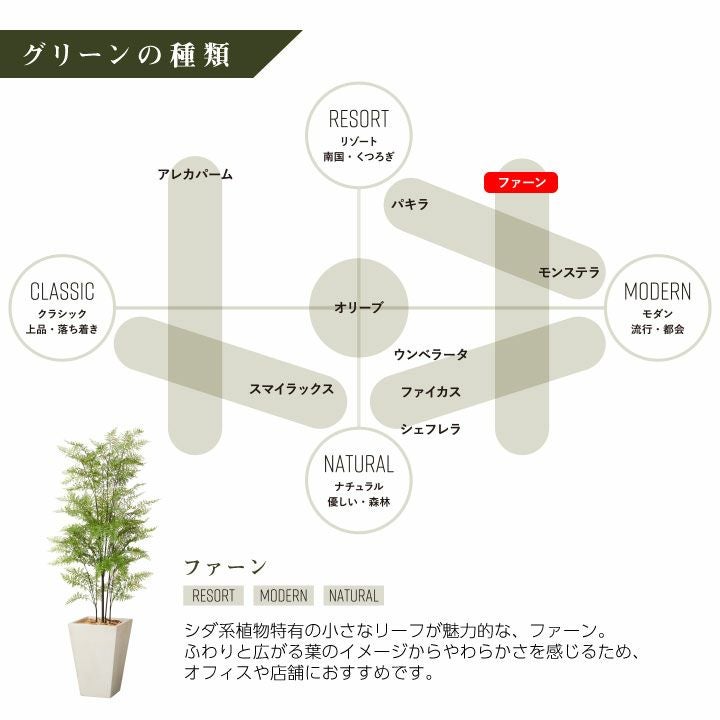 他の画像を見る wg CLAY クレイ フェイク 7-018 910-101 キューブ 165cm以下 フェイクグリーン×プランターセット「ファーン×Cube w/g」[高さ155cm・人工樹木・人工観葉植物] 販売価格 ¥ 62,700 税込 詳細を見る お気に入りに登録する (0)