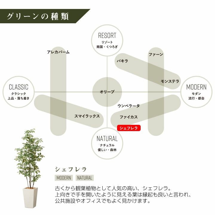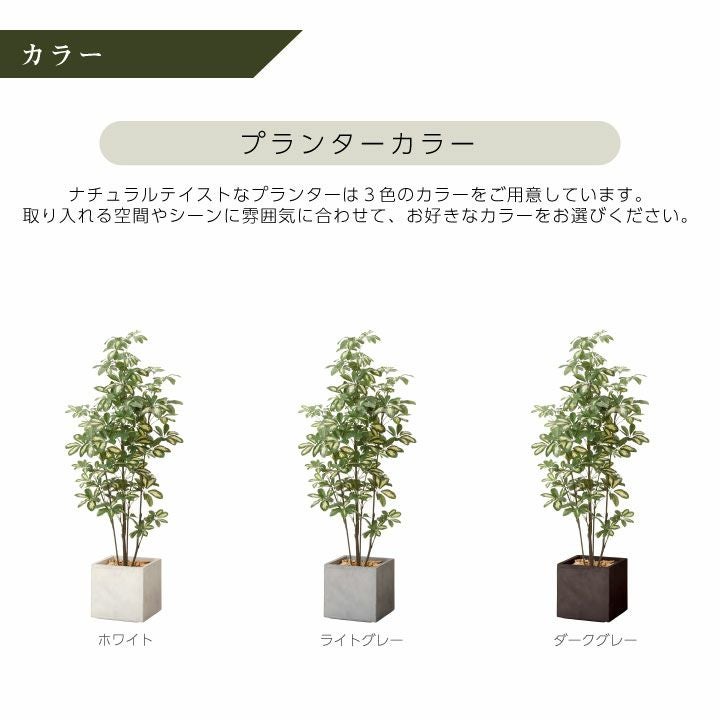他の画像を見る wg CLAY クレイ フェイク 7-026 910-101 キューブ 165cm以下 フェイクグリーン×プランターセット「シェフレラ×Cube w/g」[高さ150cm・人工樹木・人工観葉植物] 販売価格 ¥ 52,800 税込 詳細を見る お気に入りに登録する (0)