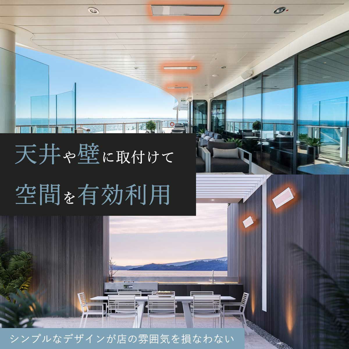錆や塩害が発生しやすい沿岸地域や中型・大型船艇にも多くの採用実績がある屋外用電気ヒーターです。太陽光と同じ放射熱で空間全体が温まるので、冬の屋外がもっと快適に、もっと楽しく過ごせます。