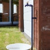 「配管パイプ立水栓」は名前の通り配管にそのまま水栓を取り付けただけのシンプルなデザインが特徴。