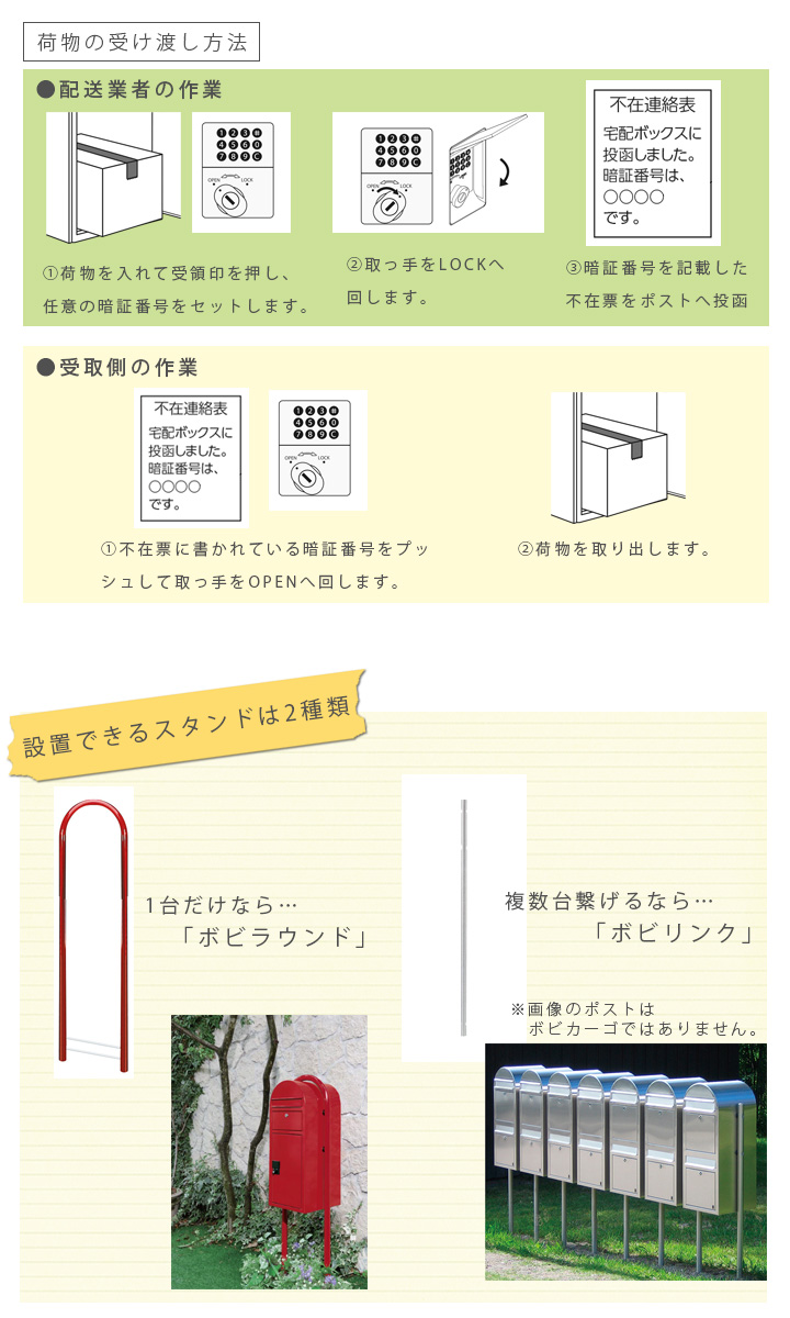 大人気のBOBI社から宅配ボックス兼郵便ポストが登場。プッシュボタン式で鍵の持ち運びが不要。電気不要なので、ランニングコストもかかりません!