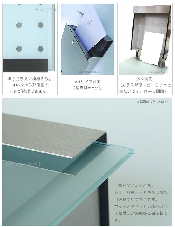 ※前面ガラスは非常に重量があります。また投函時の閉め忘れによる雨水等浸入を防ぐ為、上蓋は開けたままの状態で静止しない設計になっておりますので、郵便物取り出しの際は両手で開閉してください。片手で開閉すると手を挟んだり、怪我をする危険があります。ご注意ください。