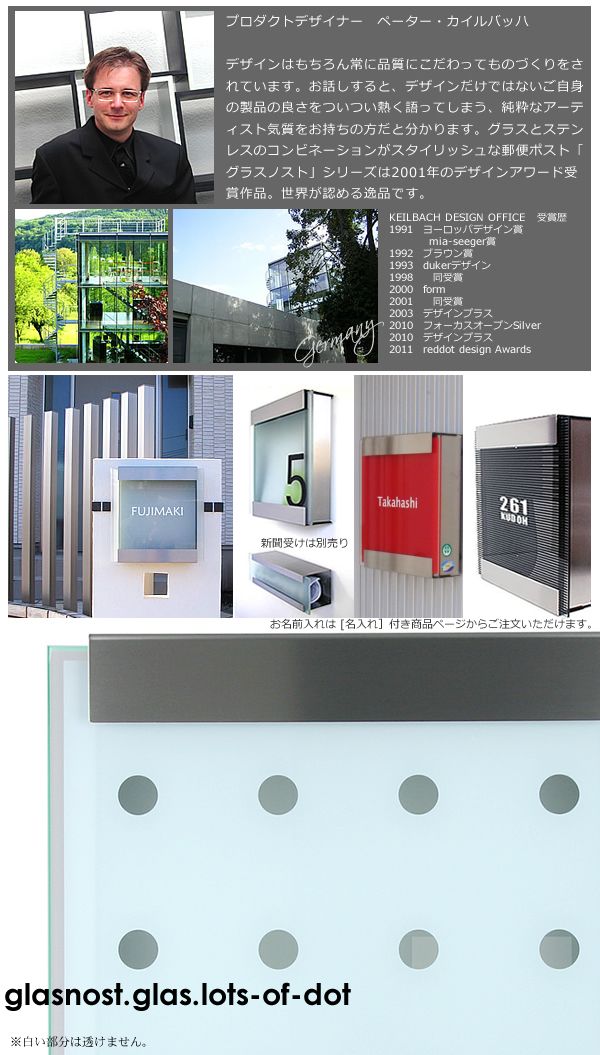 ドイツのプロダクトデザイナー、ペーター・カイルバッハデザインの郵便ポスト「グラスノスト」シリーズ。グラスとステンレスのコンビネーションがクールなポスト「グラスノスト」シリーズは、デザインアワードform2001を受賞した世界が認めるまさに逸品です。ガラスとステンレスヘアラインのコンビはモダン住宅のデザインを損なわず、よりスタイリッシュに魅せてくれます。現在アメリカでも人気が高まり注文が殺到しているのだそう。