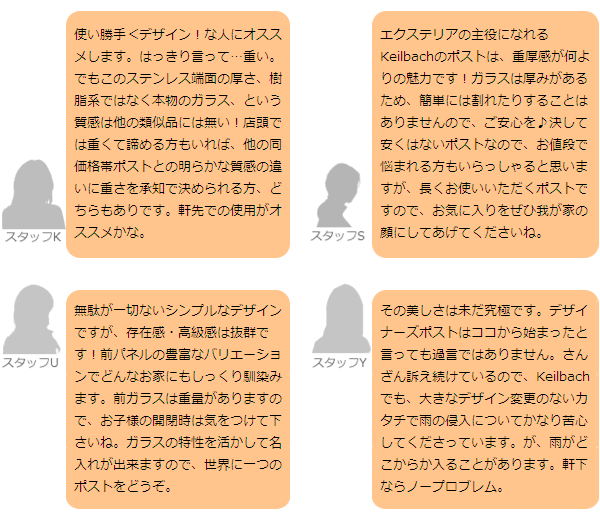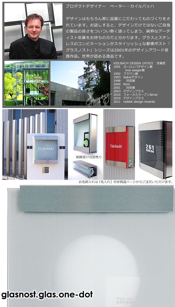 ドイツのプロダクトデザイナー、ペーター・カイルバッハデザインの郵便ポスト「グラスノスト」シリーズ。グラスとステンレスのコンビネーションがクールなポスト「グラスノスト」シリーズは、デザインアワードform2001を受賞した世界が認めるまさに逸品です。ガラスとステンレスヘアラインのコンビはモダン住宅のデザインを損なわず、よりスタイリッシュに魅せてくれます。現在アメリカでも人気が高まり注文が殺到しているのだそう。