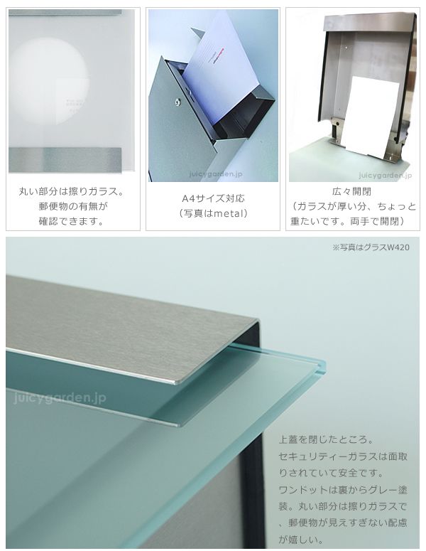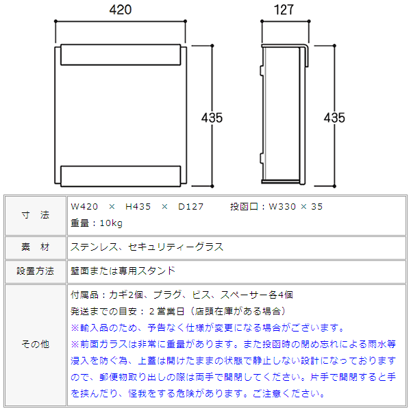 ※前面ガラスは非常に重量があります。また投函時の閉め忘れによる雨水等浸入を防ぐ為、上蓋は開けたままの状態で静止しない設計になっておりますので、郵便物取り出しの際は両手で開閉してください。片手で開閉すると手を挟んだり、怪我をする危険があります。ご注意ください。