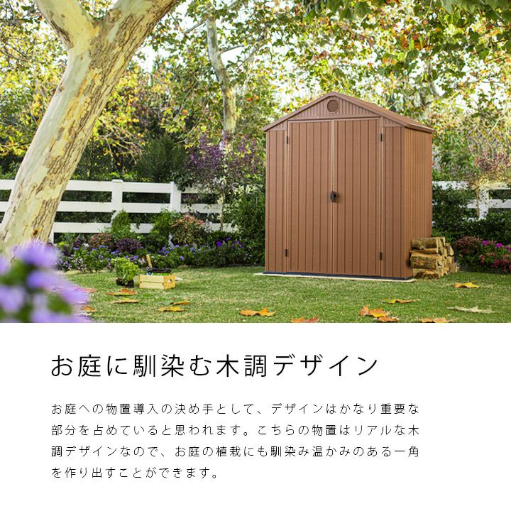 耐候性のある樹脂を採用し、デザインにもこだわったおしゃれな物置です。