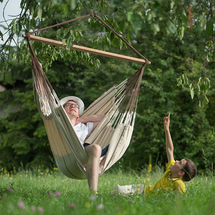 ハマクテック製を選べば、お庭にチェアハンモックが常設できるのが嬉しいところですよ。なかなか寝付かない子供と一緒に乗るなら、このキングサイズのベッドのようなロウンガーです