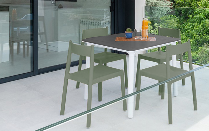 テーブルをご自宅のカラーに、チェアを借景のグリーンに合わせたコーディネート。ガラスの柵を生かし周辺の色合いに溶け込ませる組み合わせです。