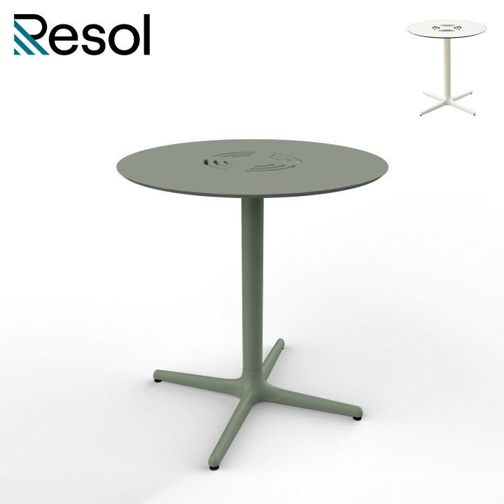 天板中央に空けられた模様のような穴がおしゃれな「Resol Toledo AIRE ラウンドテーブル 70」