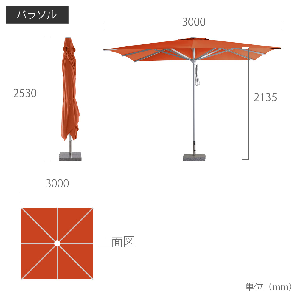サイズ:パラソル本体(オープン時・土台無し時)/W約3000×D約3000×H約2440mm、パラソル(土台含む)/H約2530mm、ポール/直径50.8mm、ベース(差込口除く)/W500×H80×D500mm