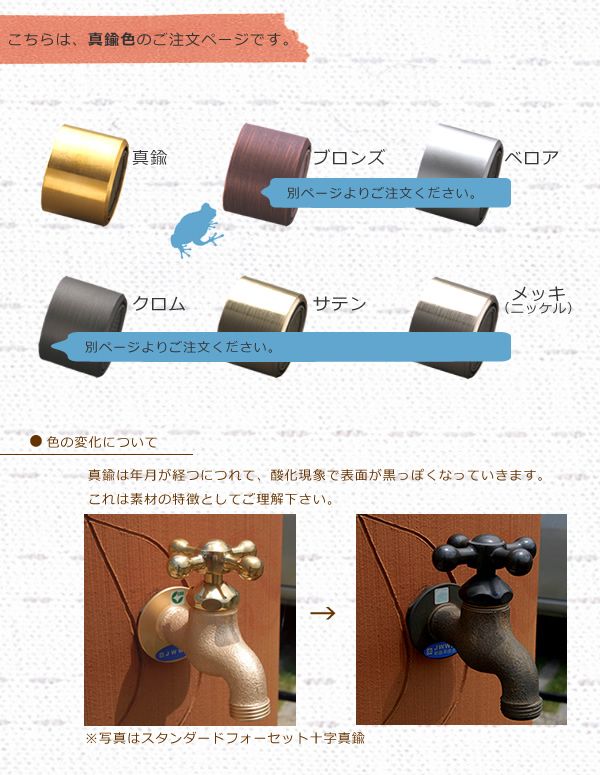 アニマル蛇口専用の泡沫アダプターです。 蛇口側にネジを回して接続します。 「立水栓が高い位置にあるから、水があちこちに飛び散る!」 「キッチンのように、アワアワの水にしたい」 「子供の手洗いにも優しく使えるように」 こんな時に便利なのが、泡沫アダプターです♪ ホース接続アダプターとは一緒に使えないので、どちらか選ばなければいけませんが、ホースを使わない蛇口には是非取り付けて欲しいのが、スタッフの本音。 ネジで回すだけなので、ホースアダプターと泡沫アダプターを取り換える事もできますよ。外した方を無くさないでね。 ※真鍮は使用するにつれて落ち着いた色に変わってきます。 ※下記表の【アニマル蛇口】【スタンダード蛇口】【キー付き蛇口】シリーズ専用です。単品で購入される場合には、お持ちの蛇口を事前によくご確認をお願い致します。「サイズが合わなかった」という理由でのご返品は承ることが出来ません。十分なご確認をお願い致します。※適合するかわからない場合には、お写真をお送りいただき、遠慮なくお尋ねください。