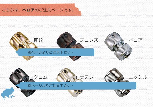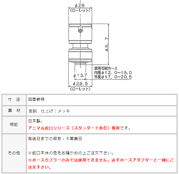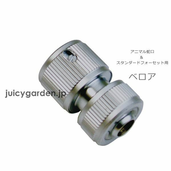 アニマル蛇口専用のホースカプラーです。 ホース側に接続します。 ジョイントと呼ぶこともあります。 「ホースをつないで洗車したい」 「大切なお庭の植物たちに水遣りしたい」 「ペットを洗いたい」 ホースをつなぐといろんなことができますよね♪ ホースカプラーは単独では使用できません。蛇口側には必ずホースアダプタを取り付けている必要がありますので、別途ご注文ください。専用のホースアダプターとお揃いのカプラーをつけて、見た目も素敵! ワンタッチでホースが取付できるので、スタッフのお薦めです。(ホースアダプターは別ページよりご注文いただけます。) ※真鍮は使用するにつれて落ち着いた色に変わってきます。 ※下記表の【アニマル蛇口】【スタンダード蛇口】【キー付き蛇口】シリーズ専用です。単品で購入される場合には、お持ちの蛇口を事前によくご確認をお願い致します。「サイズが合わなかった」という理由でのご返品は承ることが出来ません。十分なご確認をお願い致します。※適合するかわからない場合には、お写真をお送りいただき、遠慮なくお尋ねください。