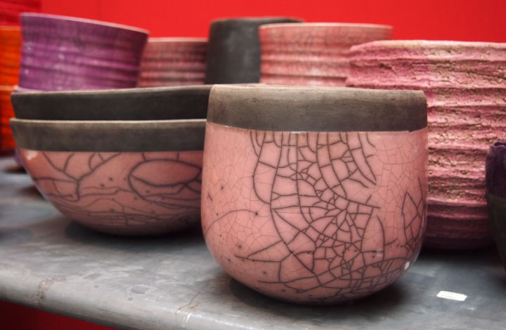 釉薬を施釉した後、オーブンで高温に熱したポットをおがくず の中に入れ急激に冷却し、その温度差によって貫入(ヒビ)を生み出します。