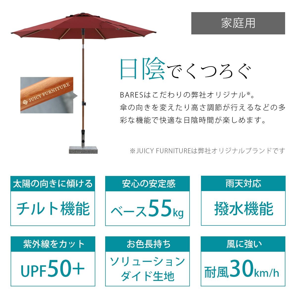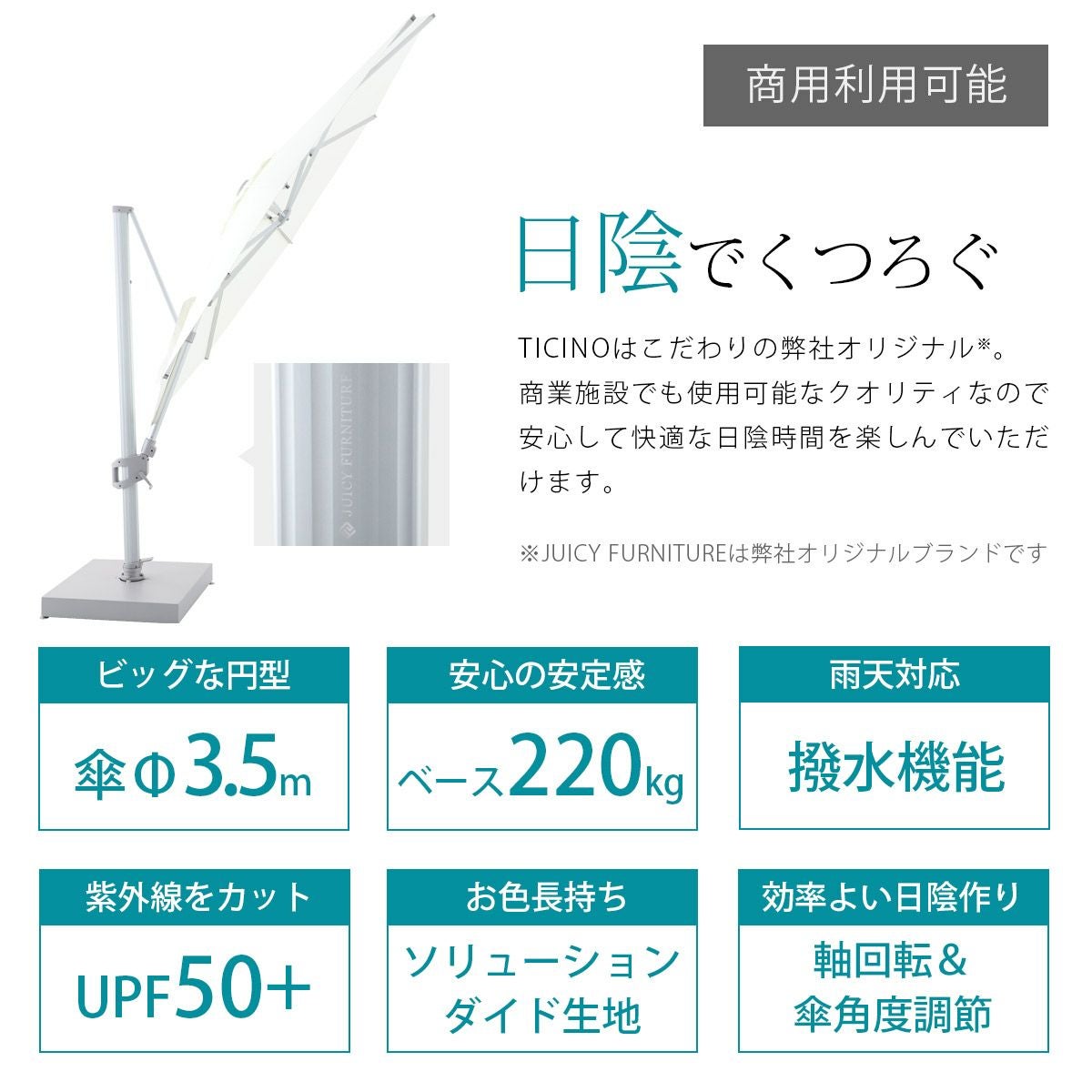 他の画像を見る 大型パラソル 日よけ 2m 四角形 紫外線 アルマイト処理 プッシュアップタイプ アルミ パラソル 土台セット 高機能 ロータス効果 UPF50+ 紫外線カット ココア 暑さ対策 「 COCOA 大型パラソル 四角形2.0×2.0m & マーブルベース 55kg セット 」 販売価格 ¥ 53,900 税込 詳細を見る お気に入りに登録する (0)