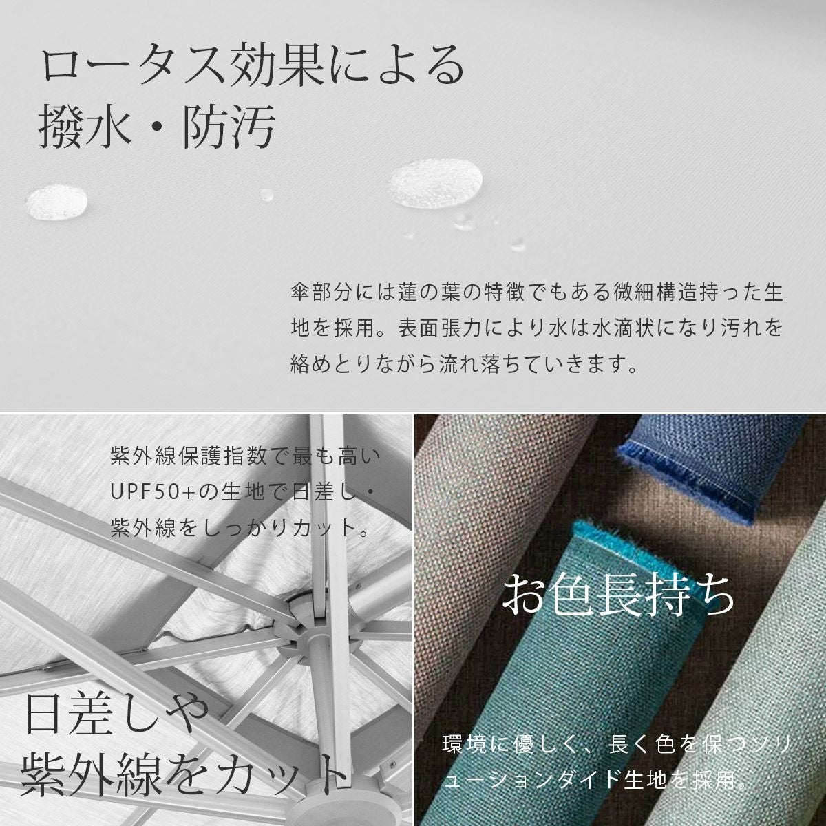 他の画像を見る 大型パラソル 日よけ 2m 四角形 紫外線 アルマイト処理 プッシュアップタイプ アルミ パラソル 高機能 ロータス効果 UPF50+ 紫外線カット ココア 暑さ対策 「 COCOA 大型パラソル 四角形 2.0×2.0m ※ベースは別売 」 販売価格 ¥ 35,200 税込 詳細を見る お気に入りに登録する (0)