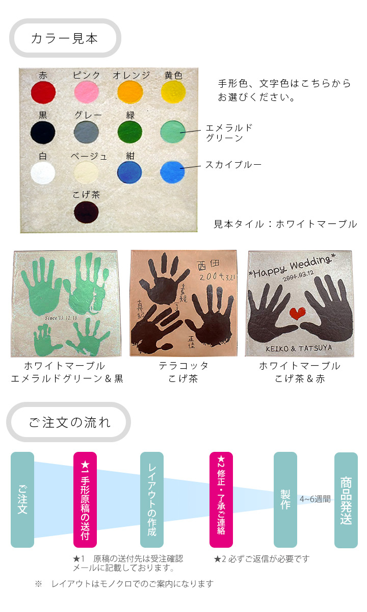 お子様の描いた絵やペットの足形、文字だけの記念プレートなんかもOKです!タイルのサイズ範囲内で、お好きにレイアウトしてください。