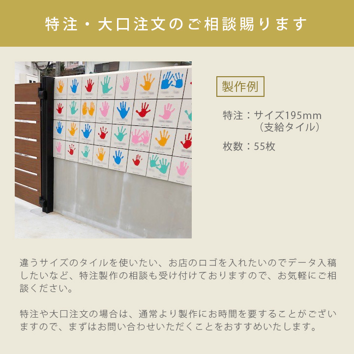 ※タイル支給での製作も可能ですが、製作はタイルにより異なり、タイルによっては製作が不可能な場合があることを予めご了承ください。(料金は、通常価格+追加料金となります)