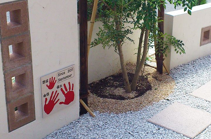 お写真をいただくと、みんな門柱の裏にというパターンが多いかな。つまり家族が毎日玄関を開けたら見えるところ。ワンコの足型もOKですよ。