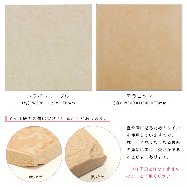 ホワイトマーブル(白系)とテラコッタ(薄茶系)、2種類のタイルからお選びいただけます。(2色までは同価格)