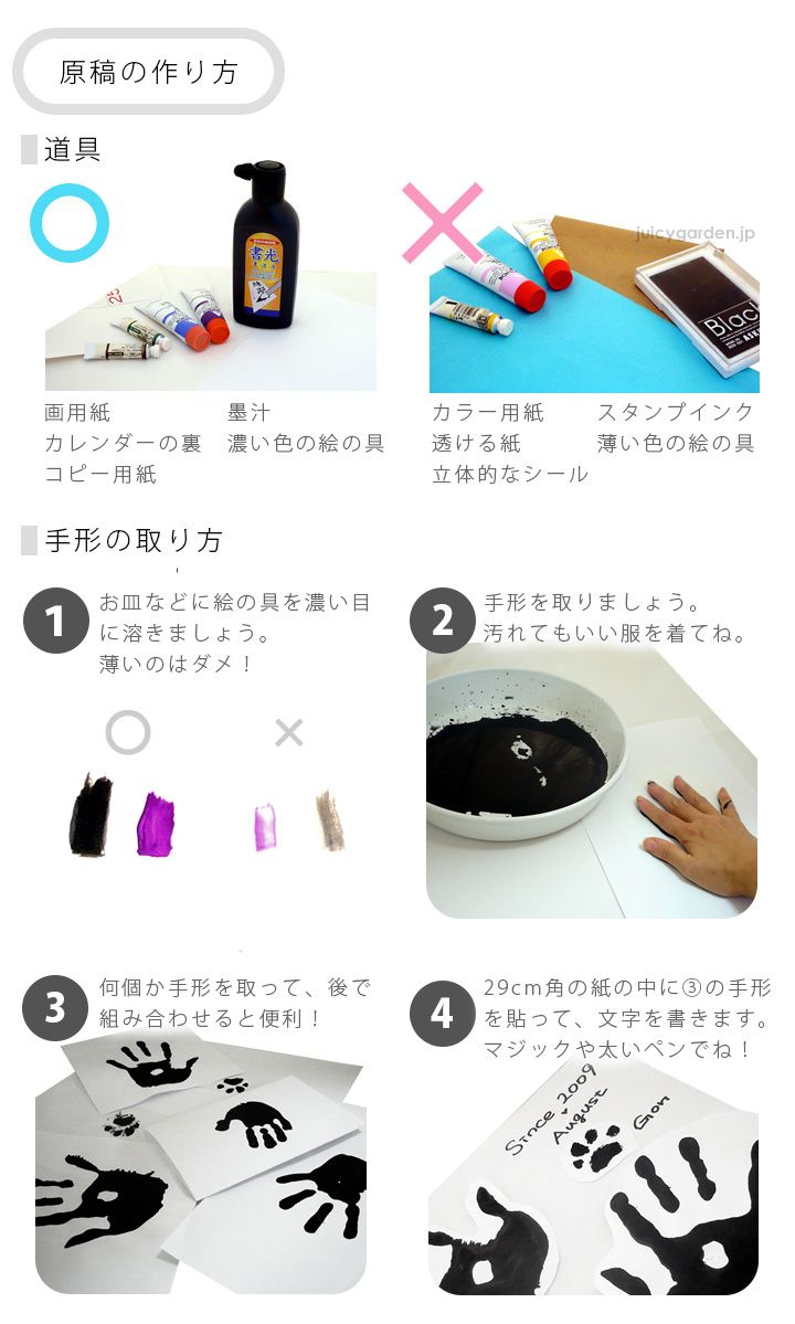 手形の色はカラフルでキレイだし、「こげ茶」っていうのも普通に手形っぽくて捨てがたい。手書きで入れる文字は味わいがあって思い出になりますね。