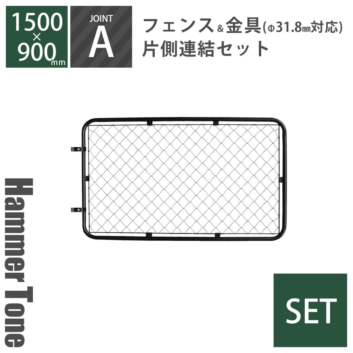 同シリーズのフェンス同士や直径31.8mmの支柱に連結できる、ハンマートーンブラックカラーの1500×900mmフェンス&ジョイント金具セットです。