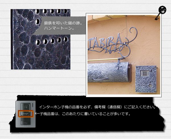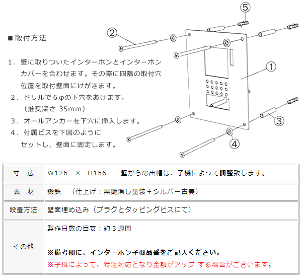 一枚板で作った、極々シンプルな形。 ロートアイアンで作っているから、手仕事が光るインターホンカバーです。 黒艶消しと古びて美しい古美塗装が特徴的。 アンティークっぽい雰囲気が出せます。 インターホンの左右上下は見えてしまいますが、アイアン表札やレンガなんかととても相性が良いですよ。 錆防止の塗装には万全を期しておりますが、当製品は鉄を主な素材にしておりますので、錆を避けられませんので、ご了承ください。早めにメンテナンスをお願い致します。す。 ※前面の切り抜き部分は、インターホン子機によって異なります。 ※子機によっては金額がアップする可能性がございます。 インターホン子機の品番を備考欄(通信欄)にご記入ください。