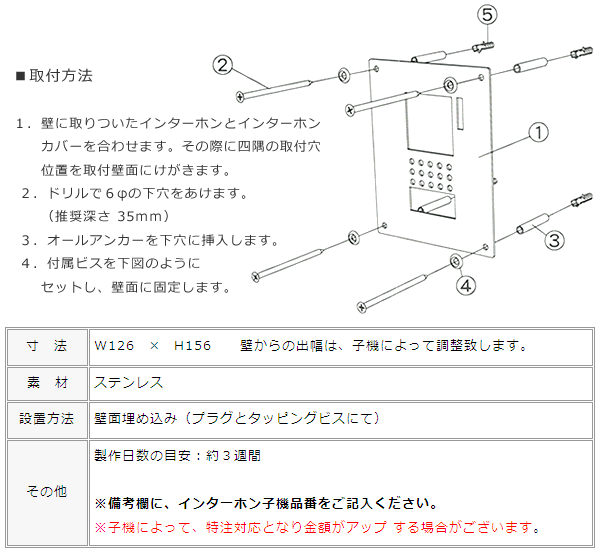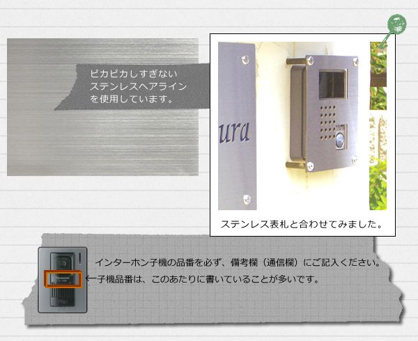 一枚板で作った、極々シンプルな形。 シャープなステンレスのインターホンカバーです。 インターホンの左右上下は見えてしまいますが、ステンレス板の表札やステンレス製のポストなんかととても相性が良いですよ。 ※前面の切り抜き部分は、インターホン子機によって異なります。 ※子機によっては金額がアップする可能性がございます。 インターホン子機の品番を備考欄(通信欄)にご記入ください。