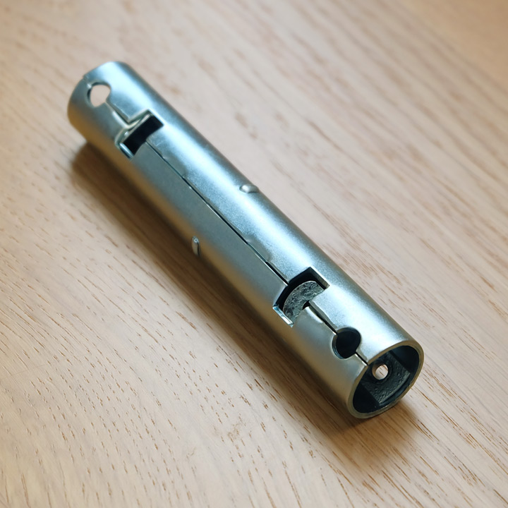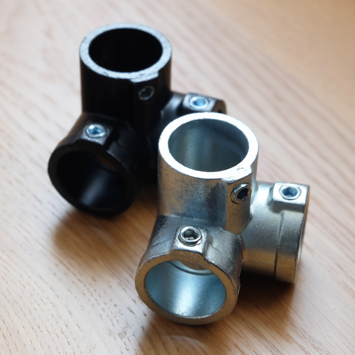 接続穴に少し遊びがあるので、単管が真っ直ぐに留まらない場合がありますが、一度六角レンチで締めを緩め、単管の位置を調整しもう一度締め直すことでま真っ直ぐにすることができます。