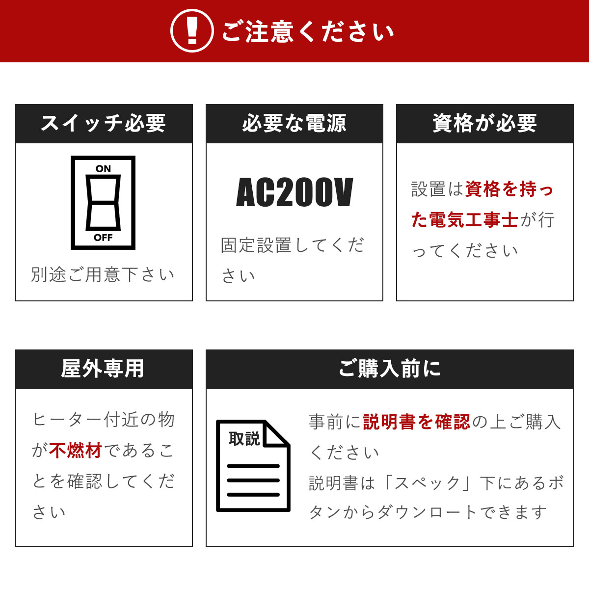 2150Wの暖房範囲は約6平米。屋外ヒーターを取り付けることによって利用可能なシーズンが増えるなどメリットがあります。