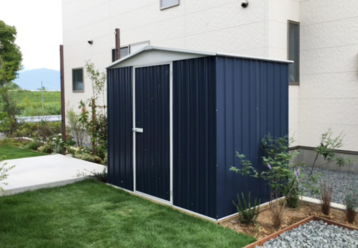 ユーロ物置はガーデンに程よく馴染み、サイズも豊富。南京錠をご用意いただければ扉のロックもできますよ。