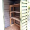 2×4材や板材を組合わせて長靴や肥料などのガーデニング用品を収納する棚を設置すれば庫内の整理整頓ができて便利です。