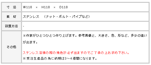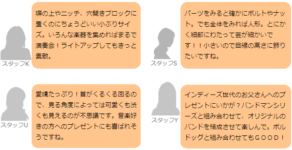 バンドマンシリーズの一つ、ドラマーです。 ステンレス溶接作家、手塚務津夫がひとつひとつステンレスのボルト、ナット、パイプを溶接で繋ぎ合わせて、ボルット君を誕生させます。 ステンレス溶接の焼色が世界に一つだけの味わいを演出 冷たい素材なのに手作りの温かさを感じるのです。 ステンレスはとても丈夫で変形や劣化に強いため、長い年月を一緒に過ごす事ができますよ。 キッチンやガーデンの飾りとして最適です。 ドラムとシンバルが本当にそれらしく、今にも叩き出しそうです。 是非バンドマンシリーズと合わせてバンドを結成させて下さいね。 手作りの温かさが伝わる作品です。この愛くるしい表情で飾る場所も選びませんね!