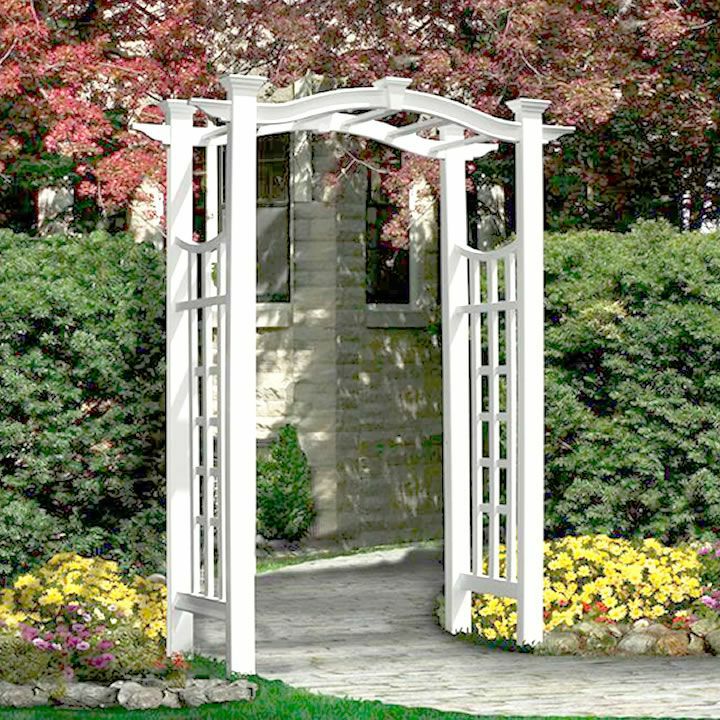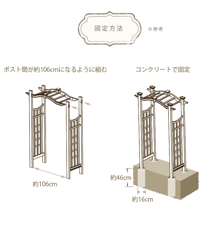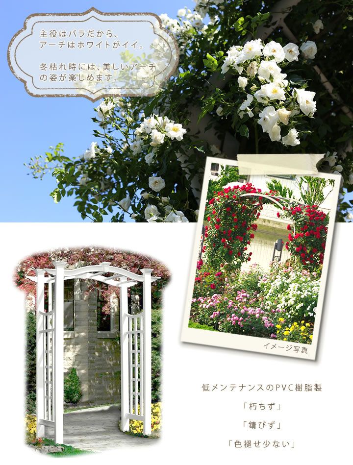アーチは柱も太くどっしりしているので、ブッシュ型のバラの背景にしても素敵!真っ白なアーチはバラやクレマチスと合わせて写真映えしますよ。