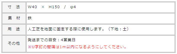 ガーデンやグラウンド等、土の下地に敷いた人工芝をしっかり固定してくれるU字釘!ご使用面積に合わせて1本から必要数量をご注文いただけます!