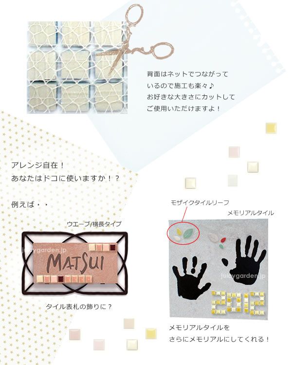 10mmの小さなタイルを150角のシート状にしたモザイクタイル。 お好きなサイズに切ってご使用いただけますよ! 塀やコンクリート土間、階段にと様々な場所をデコレーション出来る優秀なアイテムです。 シンプルなタイル表札を自分好みに可愛くアレンジしたり、手形のメモリアルタイルをご家族で飾りつけたり、ご自由にお楽しみください!