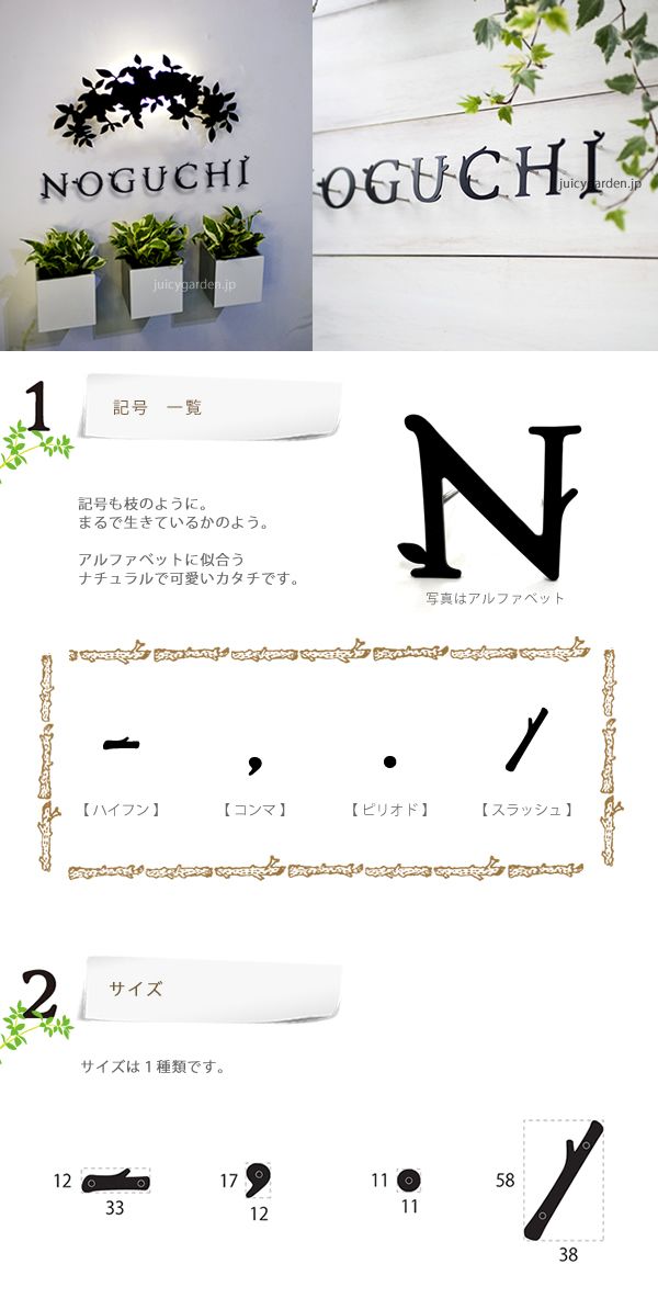 オリジナルフォントの切り文字の表札です。ひと味変わったおしゃれな切り文字はアルファベットから枝や葉が生えてきた?こちらはURLや番地に便利な【記号】です。