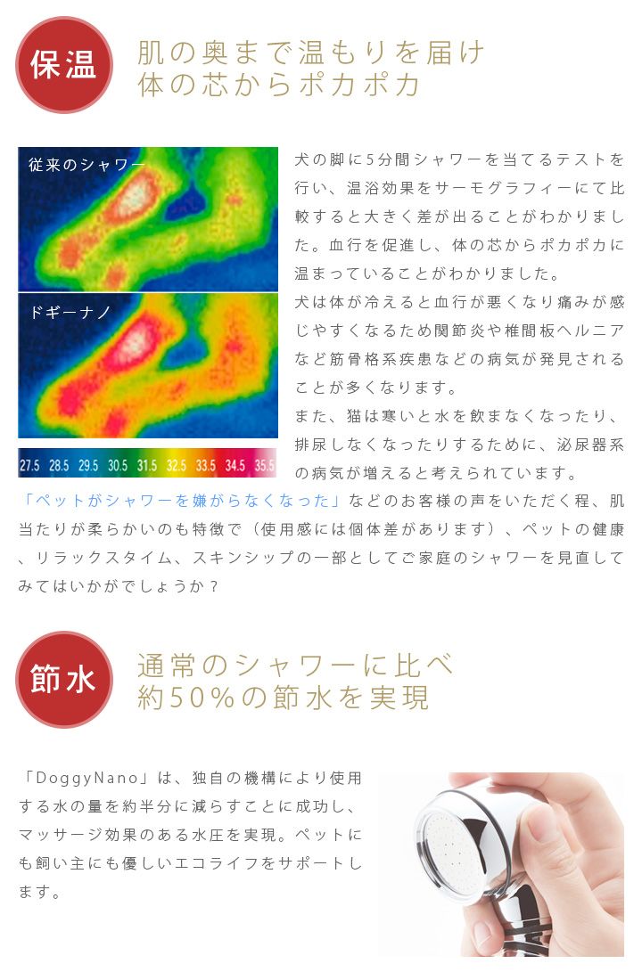 一部のペットショップにも採用されている実績のある高機能シャワーヘッドで、