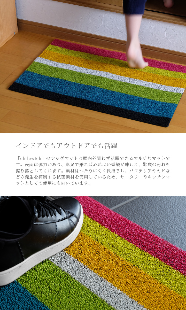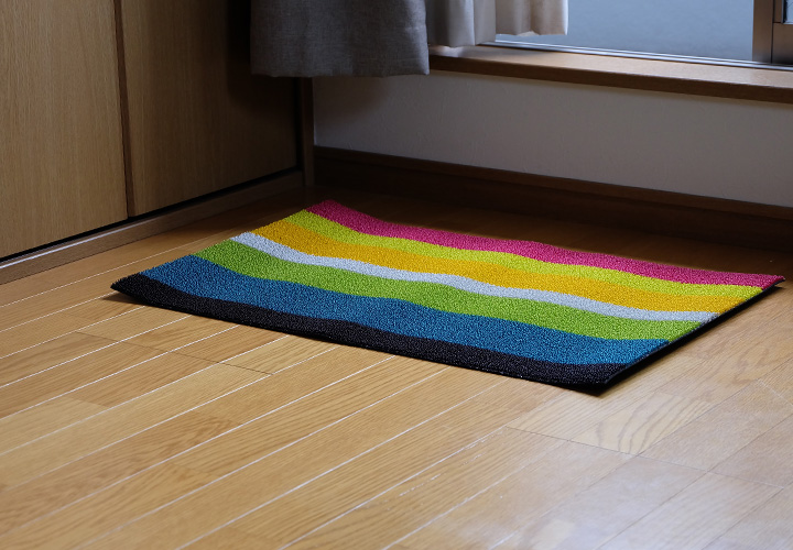 鮮やかな色合いが目を引く玄関マットです。新築祝いのプレゼントや新生活にもおすすめです。素足で乗った時の心地よさは病みつきになりますよ。