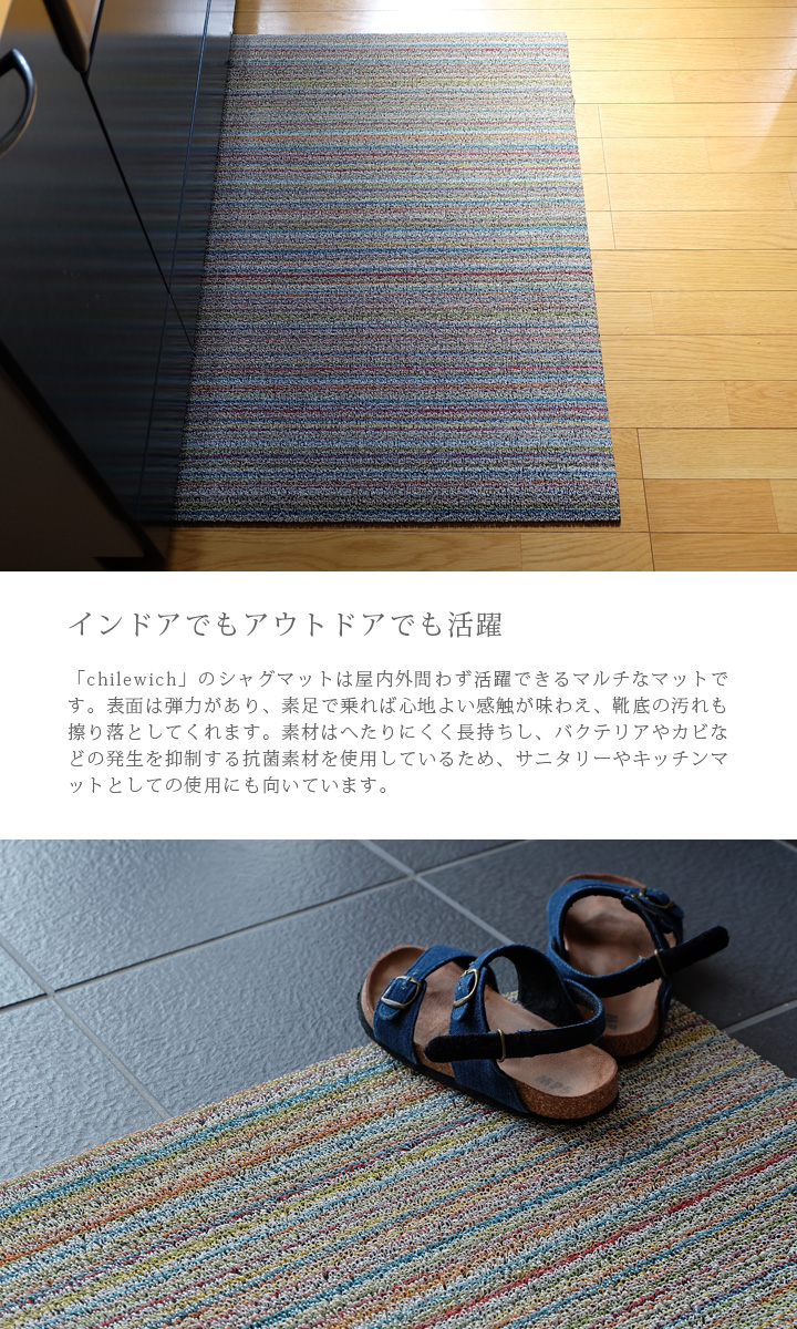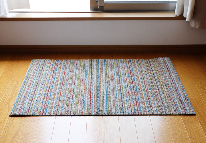 少し褪せた色合いのおかげで多色使いなのに嫌味なく配色がまとまったキレイなユーティリティマットです。新築祝いのプレゼントや新生活にもおすすめです。素足で乗った時の心地よさは病みつきになりますよ。