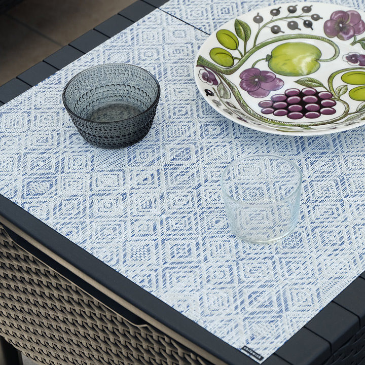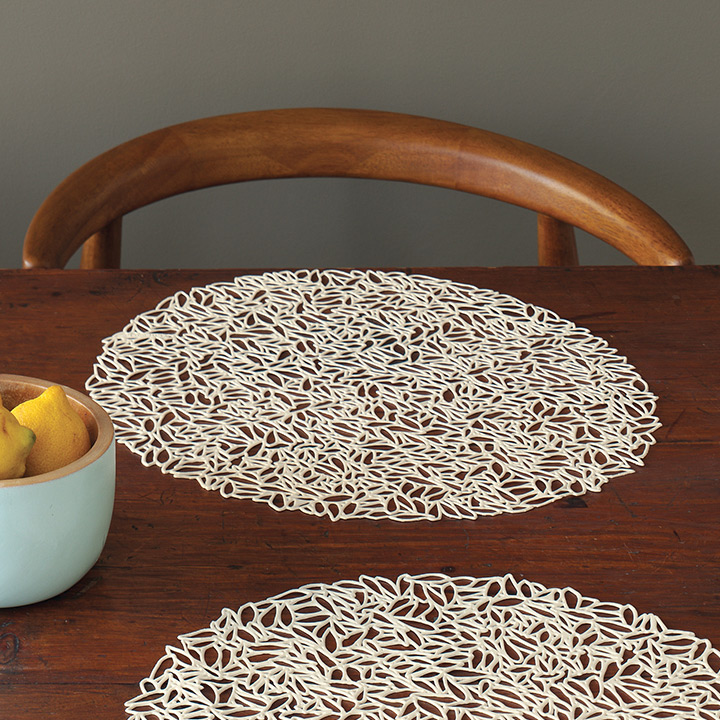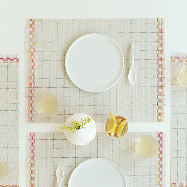 デニム用語としても有名な言葉ですが「織り端」などの意味合いを持つプレースマット「セルヴィッジ(selvedge)」。編み込みや両端のフリンジなど、まるで布地のようなテクスチャで、グリッドラインや左右に入った差し色のアクセントなど少しカジュアルっぽさもあり、白いテーブルや木製の天板にもよく合います。