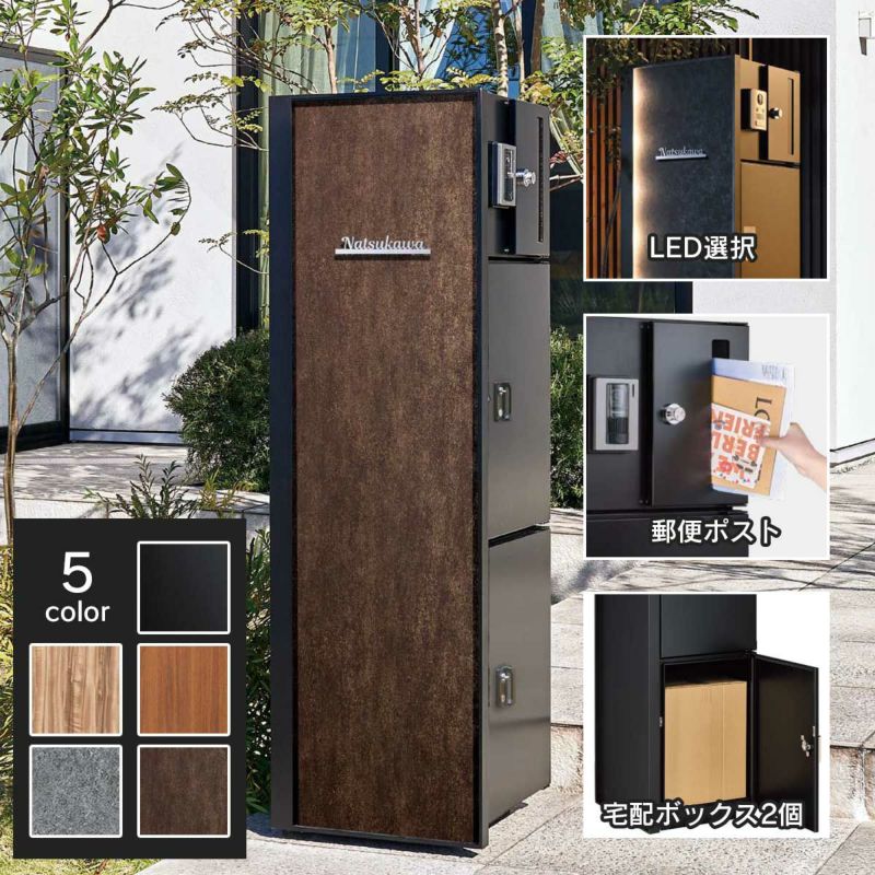 素材:本体/アルミ、亜鉛メッキ鋼板、鉄、アルミ樹脂複合板(焼付塗装)、ポスト/亜鉛メッキ鋼板(焼付塗装)、宅配ボックス/亜鉛メッキ鋼板(焼付塗装)、埋め込みベース/鉄+アルミ樹脂複合板(焼付塗装)、化粧枠・化粧パネル/アルミ、アルミ樹脂複合板+ポリ塩化ビニル(屋外用)、アクリル(焼付塗装、屋外耐候性シート貼り)