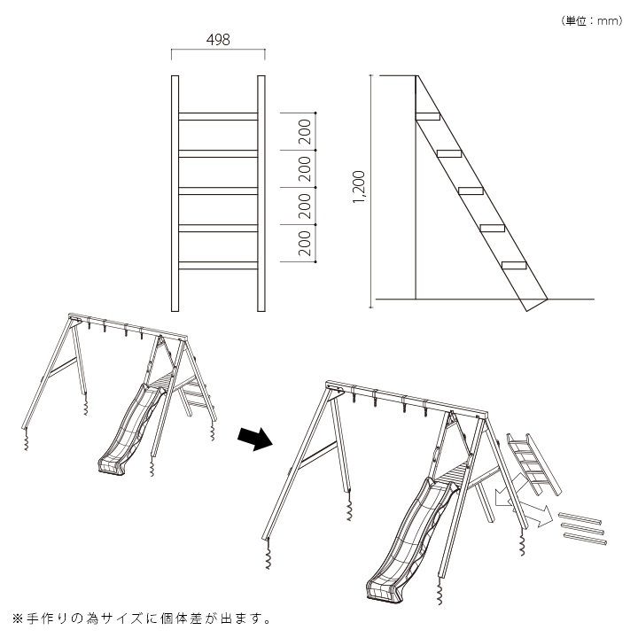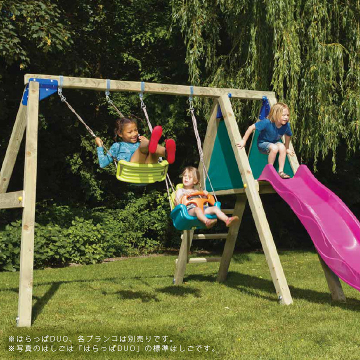 「はらっぱDUO」も標準のはしごから、こちらの階段状のものへの変更が可能です。商品は完成品でお届けいたしますので、取り付けだけの手軽さです。
