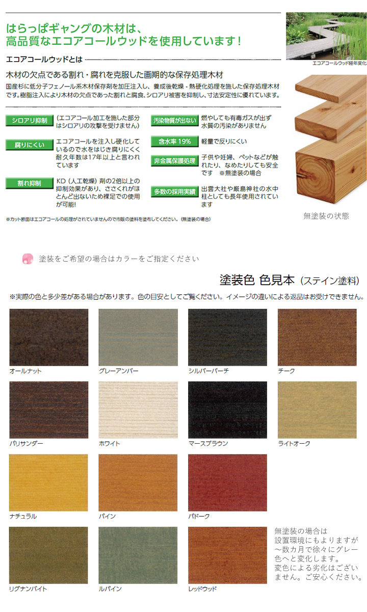 このページの商品は杉材に樹脂を注入した高耐久木材【エコアコールウッド】仕様。